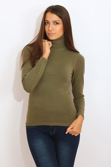 Свитер сшит из ткани оливкового цвета, модель с длинными рукавами и высоким воротником "гольф".