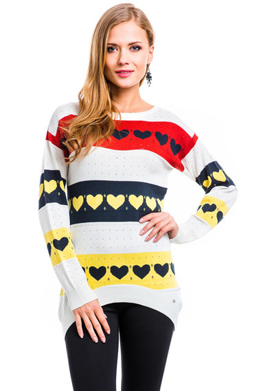 Необычный и яркий джемпер со скругленным низом. Модель удлиненная, с длинными рукавами и округлой горловиной. Интересный принт в сердечко сделает любую женщину еще более романтичной и милой.